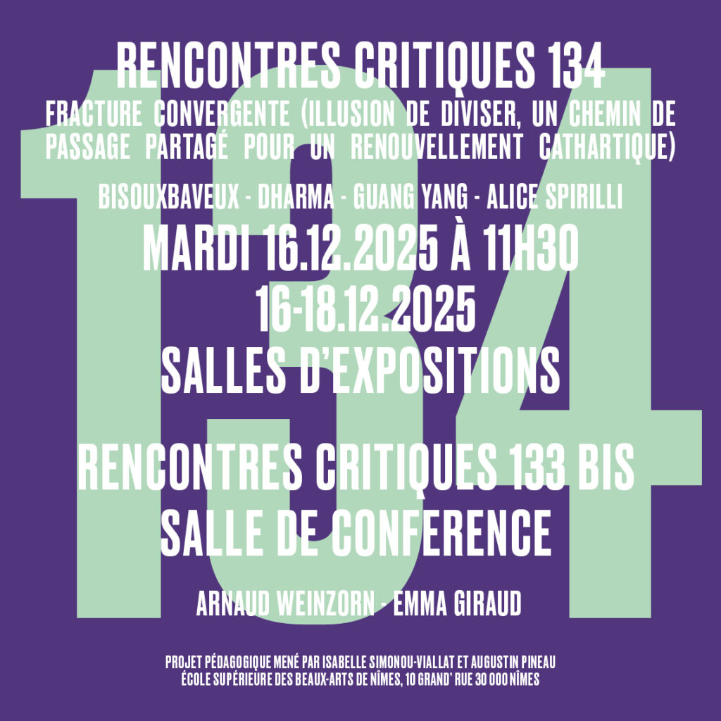 Rencontres Critiques n°133 bis & 134 : Bisouxbaveux, Dharma, Guang Yang, Alice Spirilli, Arnaud Weinzorn & Emma Giraud