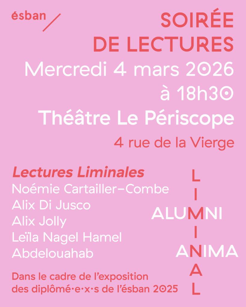 Lectures Liminales est une proposition portée par quatre diplômé·es de l’ésban — Noémie Cartailler-Combe, Alix Di Jusco, Alix Jolly et Leïla Nagel-Hamed Abdelouahab — réunissant des textes écrits et lus par les artistes elles·eux-mêmes.